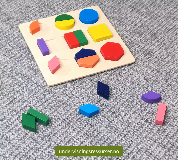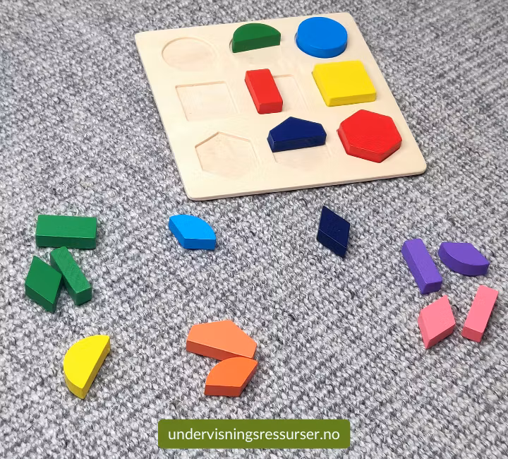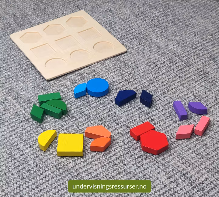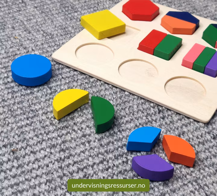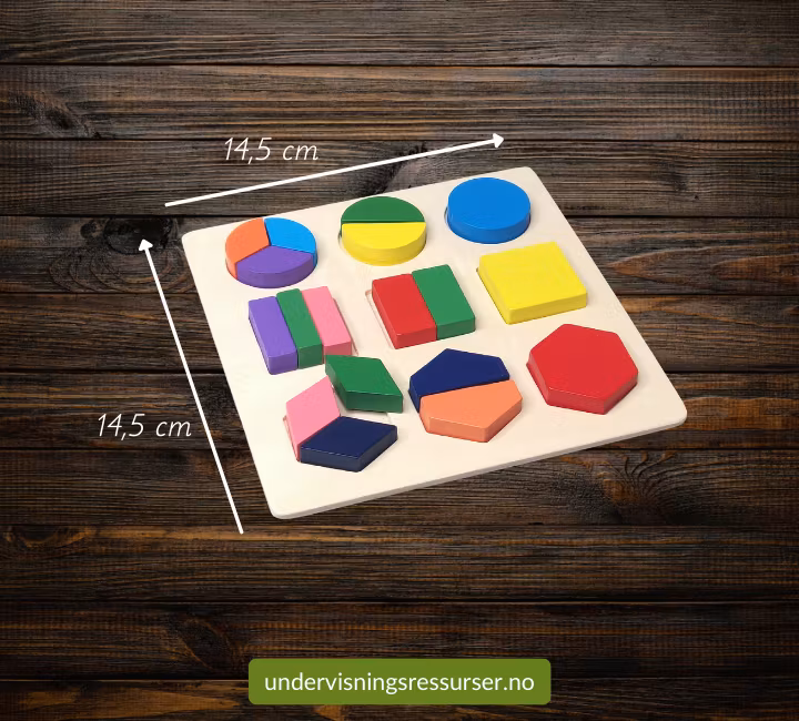 Matematikk konkretiseringsmateriell. Et lite trebrett med brøk konkreter.