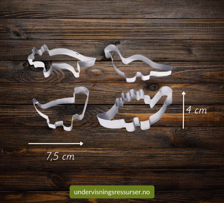 Pepperkakeformer / leireformer: Dinosaur 4 stk kr 59 Et morsomt sett med fire ulike kakestanser av metall. Tema Dinosaurer. På lager Kjøp Del Produktbeskrivelse Et morsomt sett med fire ulike kakestanser av metall. Tema Dinosaurer.Størrelse og vektFormene er ca. 4 cm x 7,5 cm.Hele settet veier ca. 37 g.